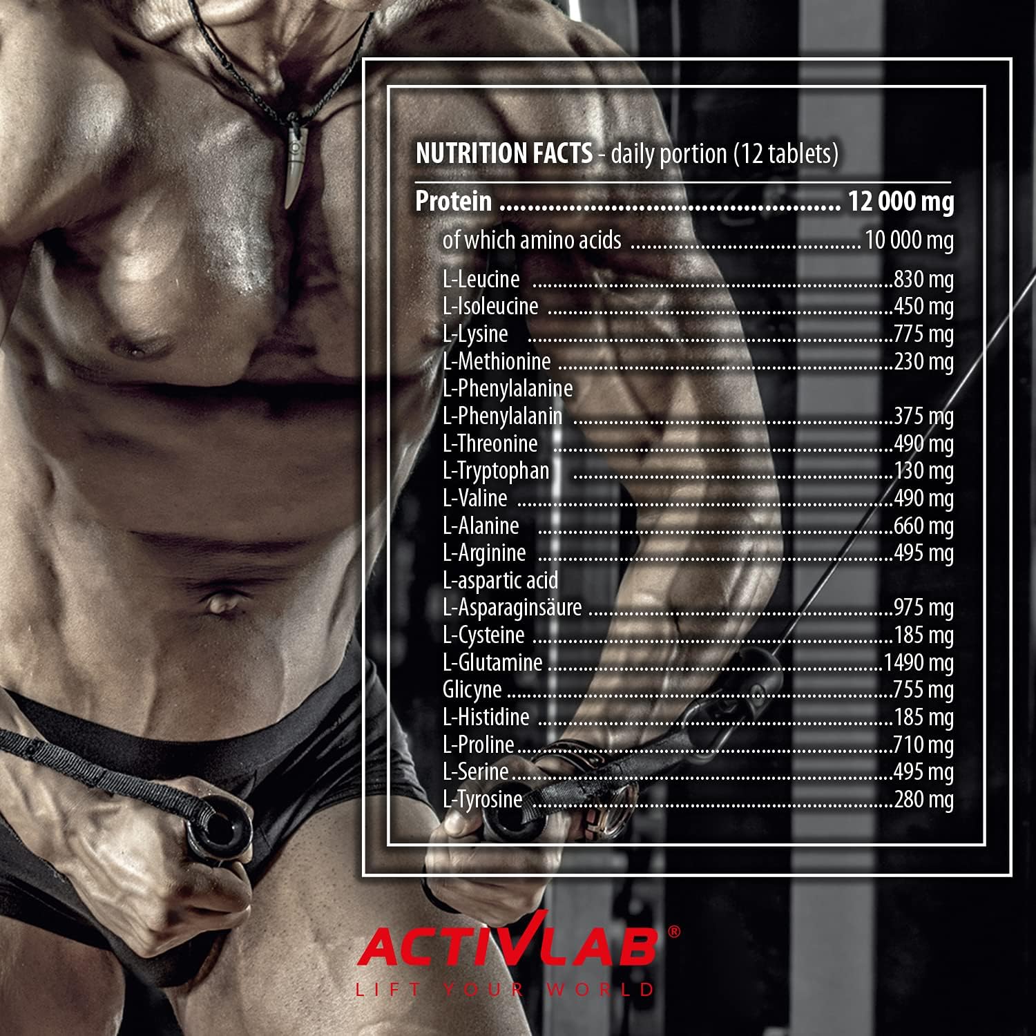 • هر وعده (4 قرص ) دارای 12000 میلی گرم پروتئین ( از 10000 میلی گرم آمینو اسید ) ، 830 میلی گرم لوسین ، 450 میلی گرم ایزولوسین ، 775 میلی گرم لیزین ، 230 میلی گرم متیونین ، 375 میلی گرم فنیل آلانین ، 490 میلی گرم ترئونین ، 130 میلی گرم تریپتوفان ، 490 میلی گرم والین ، 660 میلی گرم آلانین ، 450 میلی گرم آرژنین ، 975 میلی گرم آسپارتیک اسید ، 185 میلی گرم سیستئین ، 1490 میلی گرم گلوتامین ، 755 میلی گرم گلیسین ، 185 میلی گرم هیستیدین ، 710 میلی گرم پرولین ، 495 میلی گرم سرین و 280 میلی گرم تیروزین