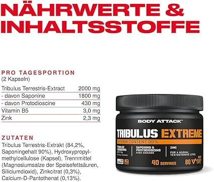 مکمل Tribulus Xtreme بادی اتک عصاره ای با کیفیت و ۹۰ درصد ساپونین از گیاه Tribulus Terrestris را ارائه می دهد که به طور طبیعی باعث افزایش تولید تستوسترون در مردان می شود و با ترکیبات پروتودیوسین ، ویتامین B5 و زینک ، سنتز پروتئین عضلانی و متابولیسم انرژی را بهبود می بخشد . مصرف تریبولوس اکستریم بادی اتک به افزایش قدرت و عملکرد عضلانی ، رشد و بازسازی عضلات و کاهش خستگی پس از تمرین کمک می کند . این محصول به حفظ تعادل هورمونی ، افزایش میل جنسی و بهبود سلامت عمومی بدن نیز کمک می کند . ترکیب علمی و استاندارد آن باعث افزایش سریع ریکاوری و بهبود سیستم عصبی می شود . بنابراین Body Attack Tribulus Extreme برای ورزشکاران و افرادی که به دنبال افزایش طبیعی تستوسترون و بهبود عملکرد بدنی هستند ، مناسب است .
