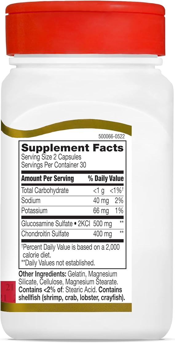| هر 2 کپسول دارای 10 کالری ، 2 گرم کربوهیدرات ، 125 میلی گرم سدیم ، 194 میلی گرم پتاسیم ، 1500 میلی گرم گلوکزامین سولفات ، 1200 میلی گرم کندرویتین سولفات |