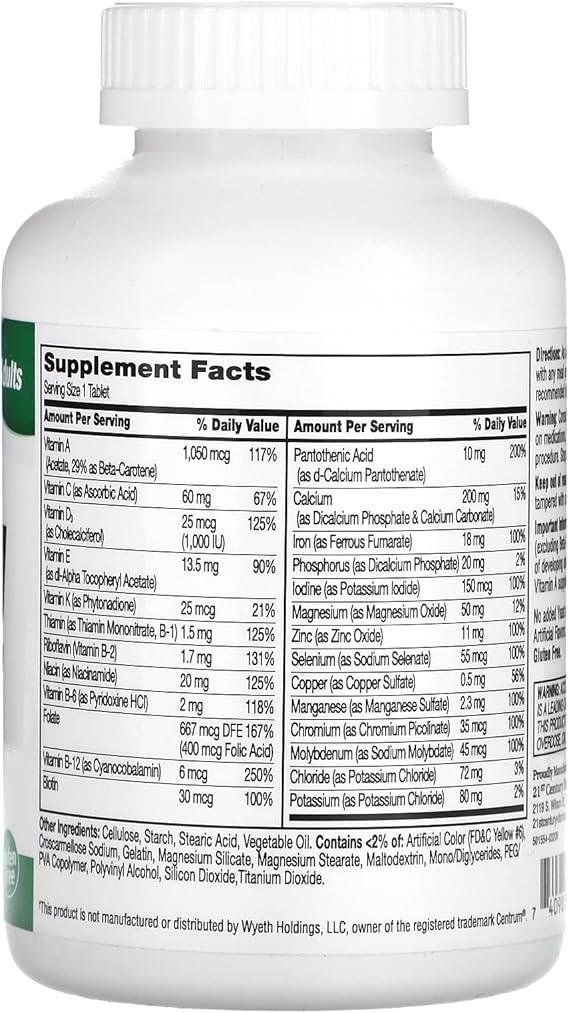 | هر وعده ( 1 قرص) دارای 1050 میکروگرم ویتامین A و 60 میلی گرم ویتامین C و 25 میکروگرم ویتامین D و 13.5 میلی گرم ویتامین E و 25 میکروگرم گرم ویتامین K و 1.5 میلی گرم ویتامین B1 و 1.7 میلی گرم ویتامین B2 و 20 میلی گرم ویتامین B3 و 2 میلی گرم ویتامین B6 و 667 میکروگرم فولات ، 6 میکروگرم ویتامین B12 و 30 میکرو گرم بیوتین ، 10 میلی گرم اسید پانتوتنیک ، 200 میلی گرم کلسیم ، 150 میکروگرم ید ، 50 میلی گرم منیزیم ، 11 میلی گرم روی ، 50 میکروگرم سلنیوم ، 0.5 میلی گرم مس ، 2.3 میلی گرم منگنز |