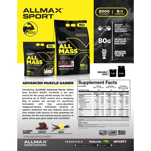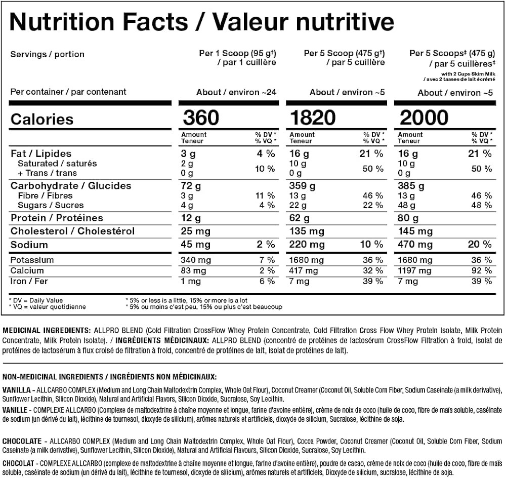 گینر آل مس آلمکس در هر 5 پیمانه مقدار زیادی کالری ( حدود 2000 کالری ) و پروتئین ارائه می کند که برای افزایش وزن و عضله سازی خشک بسیار مناسب می باشد .