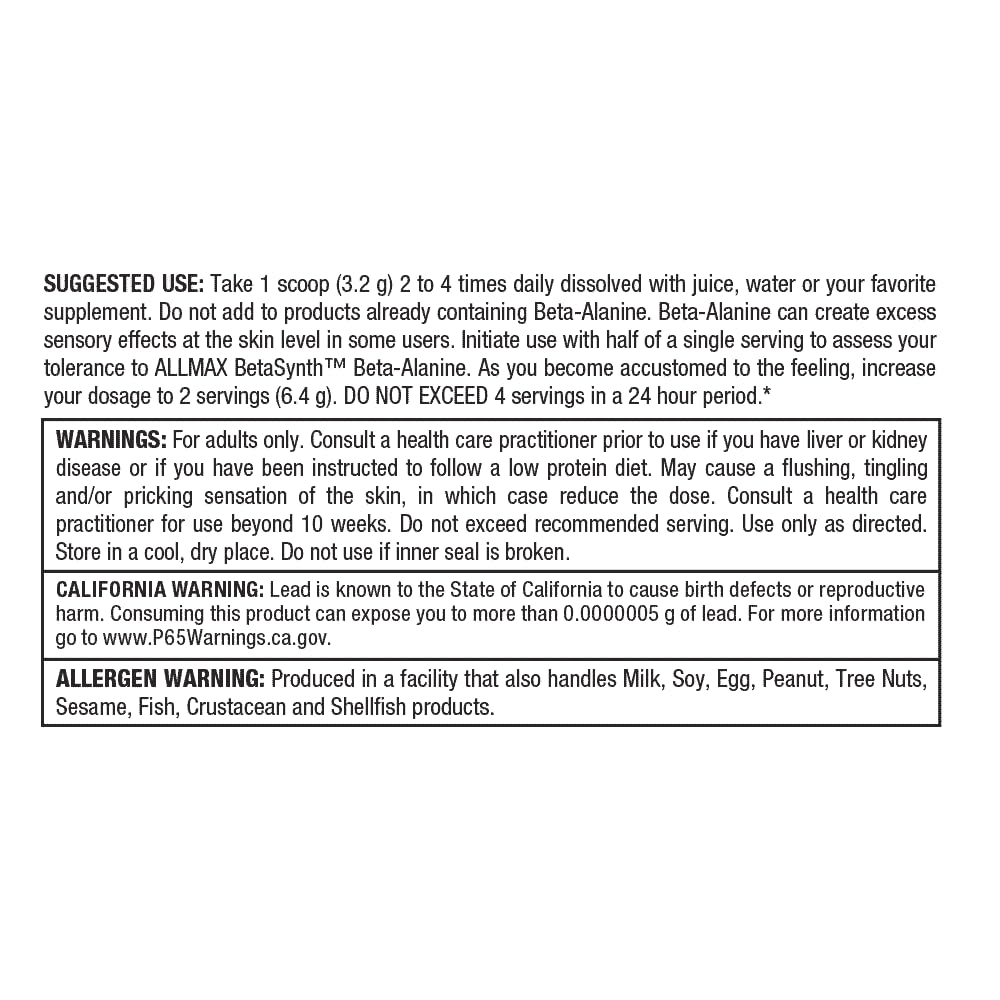 مکمل Beta-Alanine آلمکس با هدف افزایش قدرت و استقامت عضلانی طراحی شده است . این مکمل با تأمین بتا آلانین کافی ، ذخایر کارنوزین سلولی را افزایش می دهد ، که یکی از قوی ترین بافر های اسیدی بدن محسوب می شود و در کاهش اسیدی شدن عضلات نقش کلیدی دارد . کارنوزین تولید شده در بدن تنها به مدت کوتاهی برای فعالیت های روزانه کافی است ، بنابراین مصرف مکمل بتا آلانین آلمکس ناتریشن توانایی انجام تمرینات با شدت بالا و طولانی تر را افزایش می دهد . این فرمول به بهبود روند عضل هسازی و رشد عضلات کمک می کند و کاملاً زود جذب و بدون مواد افزودنی است . بتا آلانین Allmax با پشتیبانی از تمرینات شدید ، گزینه ای ایده آل برای ورزشکاران قدرتی و بدنسازان محسوب می شود .
