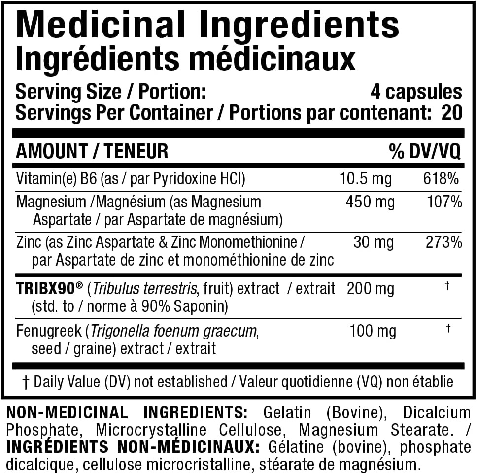 | هر 4 کپسول دارای 10.5 میلی گرم ویتامین B6 و 450 میلی گرم منیزیم ، 30 میلی گرم زینک ، 200 میلی گرم عصاره ی Tribulus Terrestris و 200 میلی گرم عصاره ی زغال اخته ، 100 میلی گرم بورون سیترات |