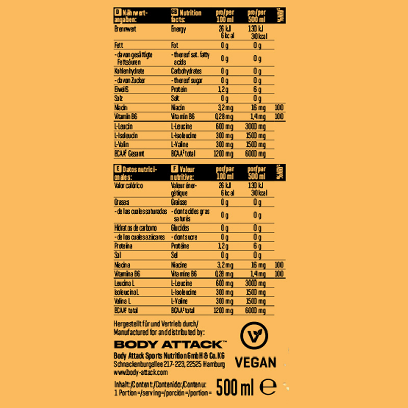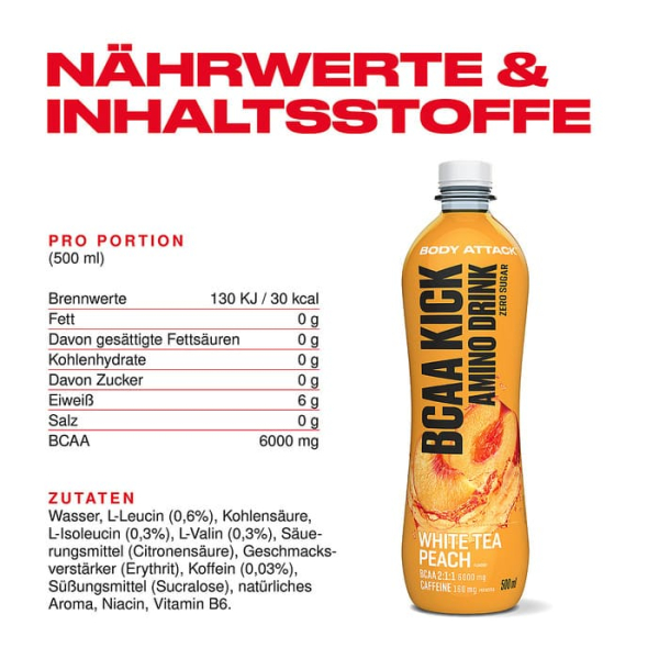 BCAA Kick Amino Drink بادی اتک یک نوشیدنی آمینو اسیدی آماده مصرف است که برای بهبود عملکرد ورزشی و ریکاوری عضلانی طراحی شده است . این محصول حاوی 6000 میلی گرم BCAA با نسبت علمی 2:1:1 لوسین ، ایزولوسین و والین می باشد که نقش کلیدی در سنتز پروتئین عضلانی ایفا می کنند . وجود 160 میلی گرم کافئین در نوشیدنی BCAA Kick بادی اتک موجب افزایش تمرکز و استقامت فیزیکی در تمرینات می شود . ویتامین های نیاسین و B6 در این محصول نیز به کاهش خستگی و بهینه سازی متابولیسم انرژی کمک می کنند . این نوشیدنی بدون قند ، کمکالری و فاقد رنگ مصنوعی بوده و برای افراد وگان مناسب است. Body Attack BCAA kick Amino Drink گزینه ای علمی برای حمایت از عضلات در تمرینات شدید محسوب می شود .