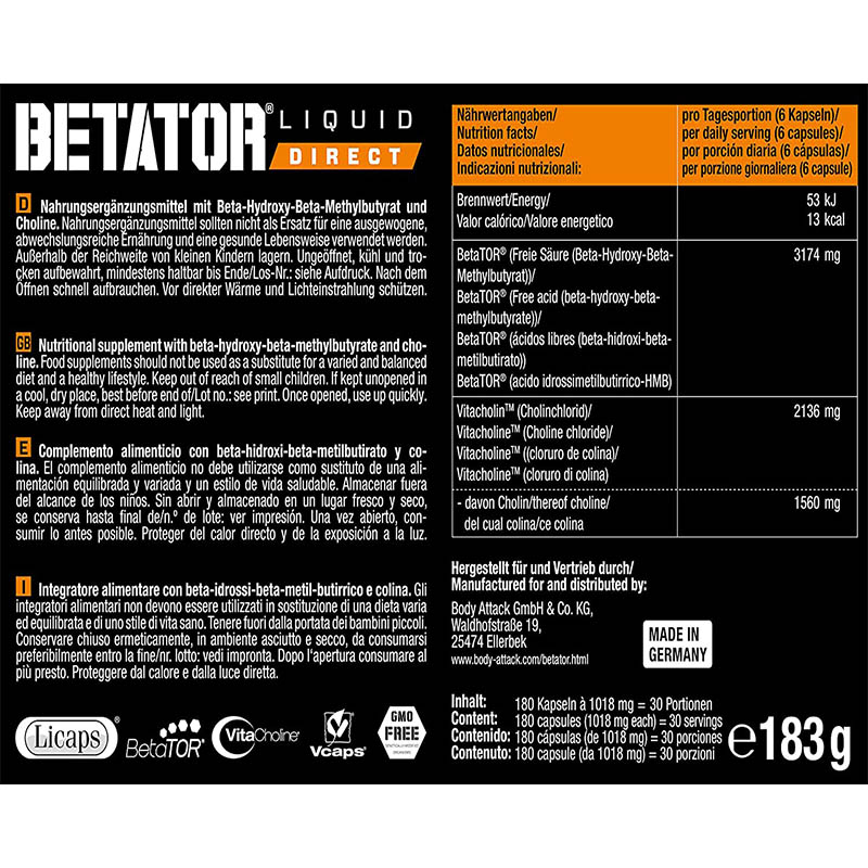بتاتور فرم خالص بتا هیدورکسی بتا متیل بوتیرات ( HMB ) میباشد . بتاتور به طور طبیعی در بدن طی متابولیسم آمینو اسید ضروری لوسین تولید می شود . مکمل Body Attack Betator حاوی ۳ گرم HMB در هر وعده است و برای افزایش قدرت ، حجم و ضخامت عضلات طراحی شده است . HMB از تجزیه پروتئین جلوگیری کرده و با تحریک مسیر mTOR سنتز پروتئین در ماهیچهها را افزایش می دهد . کولین موجود در این محصول نیز عملکرد مغز ، سیستم عصبی و متابولیسم را بهبود می بخشد . Betator بادی اتک ریکاوری پس از تمرینات سنگین را تسریع کرده و انرژی و توان فیزیکی بدن را افزایش می دهد . بتاتور Body Attack به شکل کپسول های مایع برای جذب سریع تر تولید شده و مصرف منظم آن عملکرد تمرینی و سلامت عضلات را بهینه می کند .