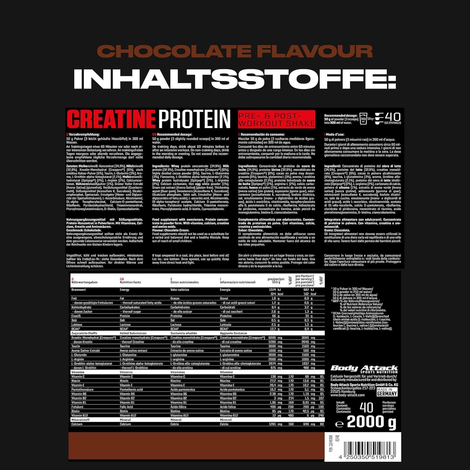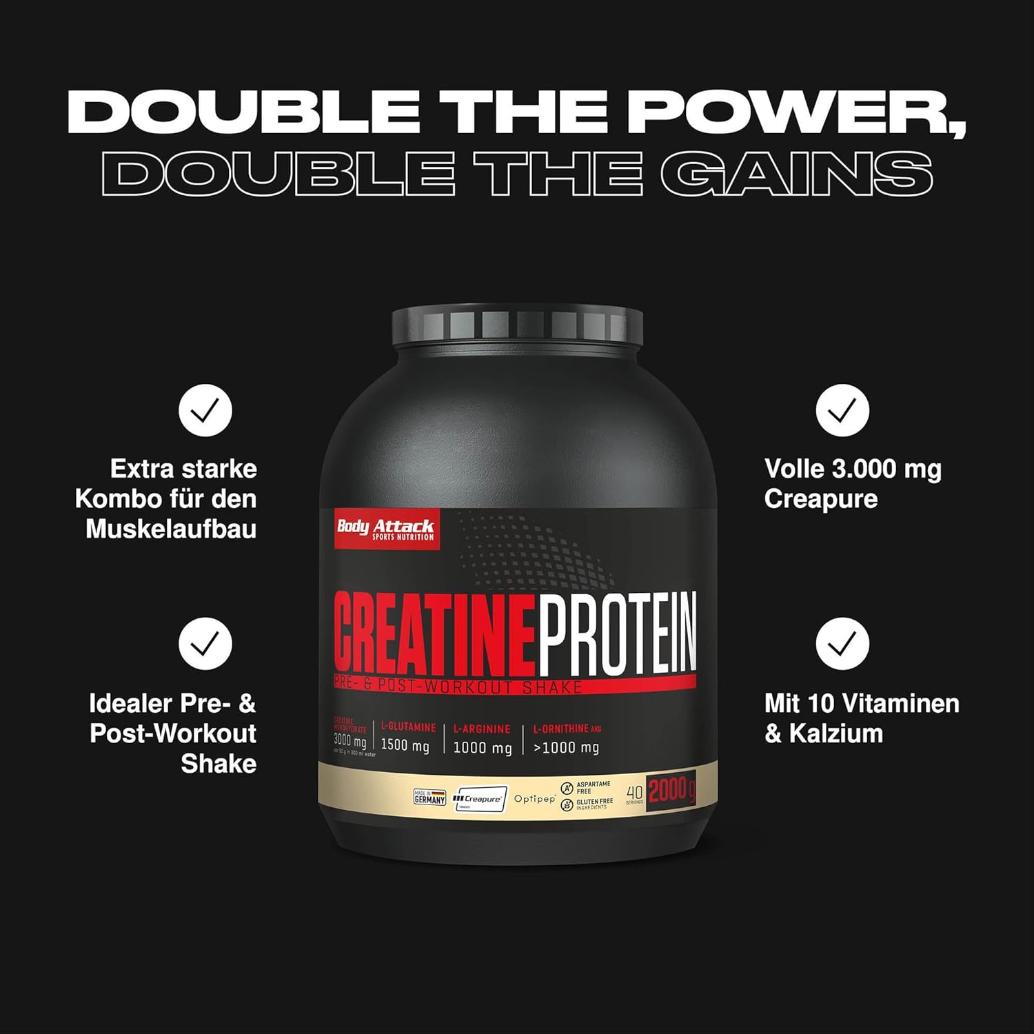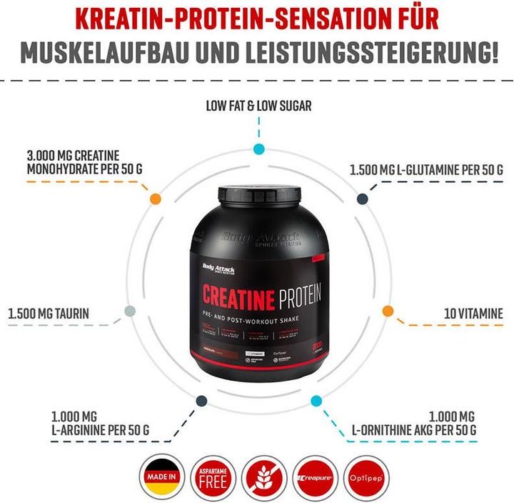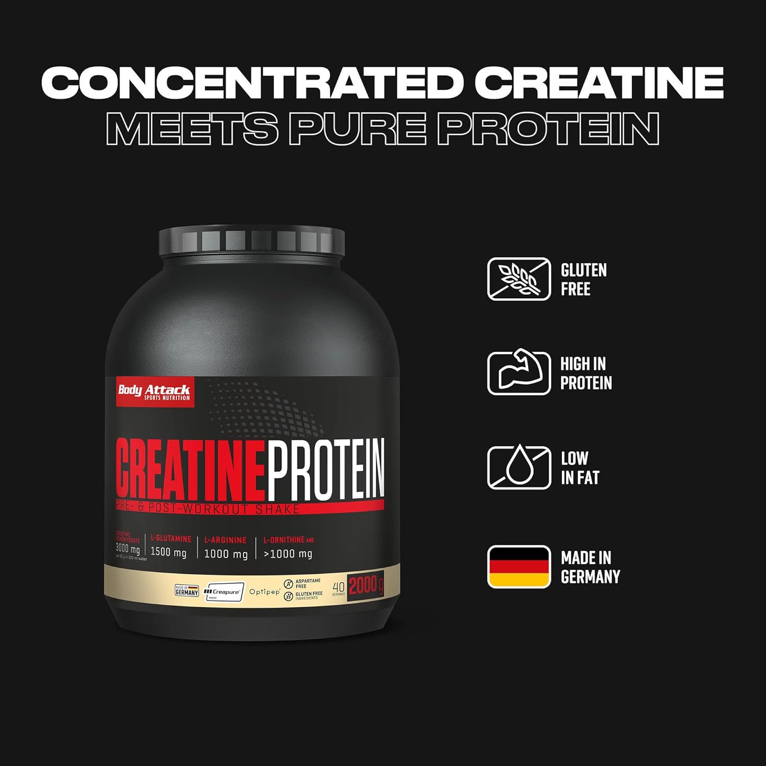 مکمل Body Attack Creatine Protein ترکیبی از پروتئین وی و مونوهیدرات کراتین است که برای افزایش رشد و حفظ عضلات طراحی شده است . پروتئین وی طیف گسترده ای از اسید های آمینه ضروری را فراهم می کند که به سرعت جذب شده و به عضله سازی و کاهش چربی کمک می کند . کراتین مونوهیدرات به افزایش قدرت و عملکرد در تمرینات کوتاه و فشرده کمک می کند . این محصول با ویتامینها ، کلسیم ، گلوتامین و تورین فرمولی جامع برای پشتیبانی انرژی و ریکاوری عضلات ارائه می دهد .کراتین پروتئین Body Attack باعث بهبود توان بدنی ، افزایش استقامت و ارتقای عملکرد ورزشکاران می شود . این محصول فرمولی کامل برای حمایت از عملکرد تمرینی و حفظ سلامت عضلات فراهم می کند .