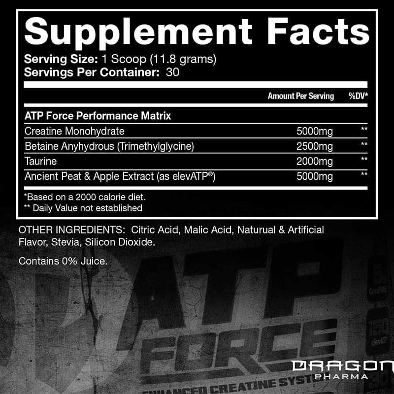 | هر وعده ( 11.8 گرم ) دارای 5000 میلی گرم کراتین مونوهیدرات ، 2500 میلی گرم بتائین بدون آب ، 2000 میلی گرم تائورین و 5000 میلی گرم عصاره ذغال سنگ نارس باستانی ، عصاره ی سیب |