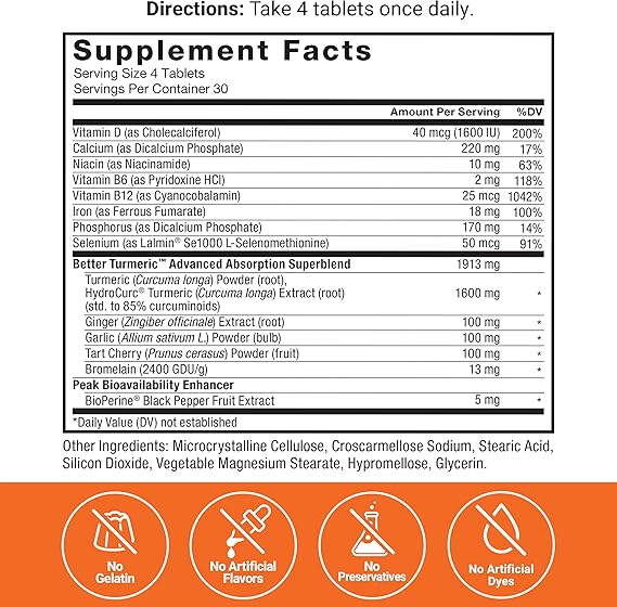 مکمل Better Turmeric فورس فاکتور محصولی پیشرفته برای حمایت از مفاصل ، کاهش التهاب و تسریع ریکاوری عضلات است . این محصول در هر وعده حاوی ۱۶۰۰ میلی گرم کورکومین خالص از نوع HydroCurc می باشد که جذب آن تا %329 بیشتر از زردچوبه معمولی است . Force Factor Better Turmeric با بهرهگیری از ترکیبات فعال سیر ، زنجبیل ، ویتامین D ، ویتامینهای گروه B و عصاره فلفل سیاه BioPerine ، موجب افزایش جذب ، تقویت ایمنی و کاهش استرس اکسیداتیو می شود . کورکومین با خاصیت آنتی اکسیدانی و ضدالتهابی قوی ، از تخریب سلولی و التهاب مفاصل ناشی از آرتریت جلوگیری می کند و به ریکاوری سریع تر بعد از تمرینات ورزشی کمک می نماید . ترمریک Force Factor در بهبود پروفایل چربی خون ، کاهش مقاومت انسولینی و پیشگیری از بیماری های قلبی و متابولیک نیز مؤثر است .