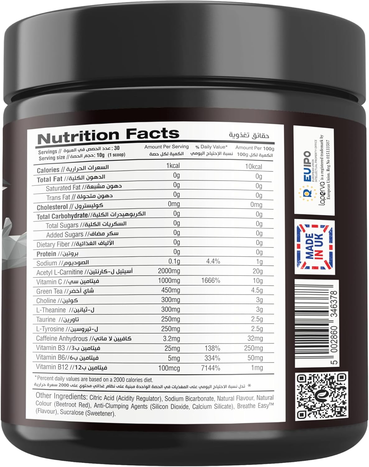 | هر وعده ( 10 گرم ) دارای 1 کالری ، 0.1 گرم سدیم ، 2000 میلی گرم استیل ال کارنیتین ، 1000 میلی گرم ویتامین C و 450 میلی گرم چای سبز ، 300 میلی گرم کولین ، 300 میلی گرم ال تیانین ، 250 میلی گرم تائورین ، 250 میلی گرم ال تیروزین ، 3.2 میلی گرم کافئین بی آب ، 25 میلی گرم ویتامین B3 و 5 میلی گرم ویتامین B6 و 100 میکروگرم ویتامین B12 |