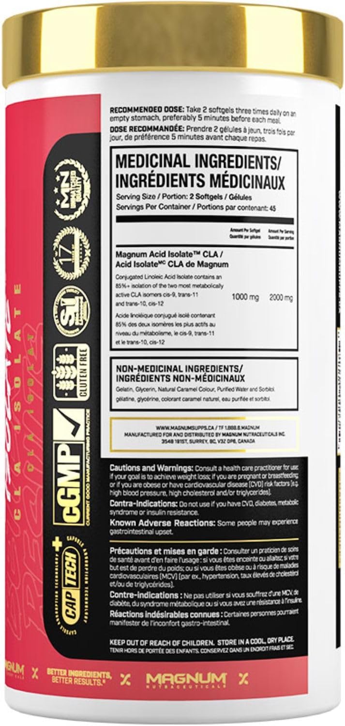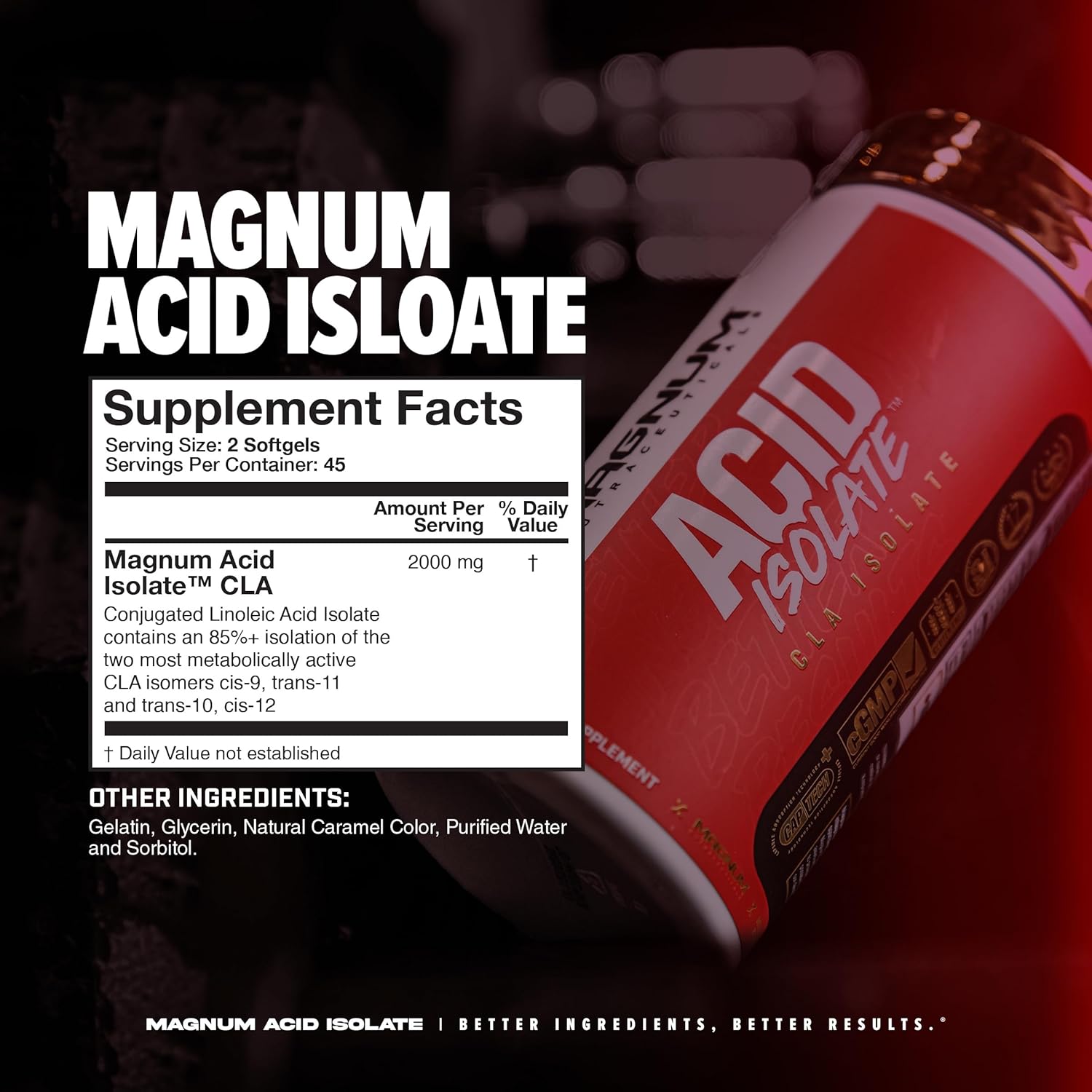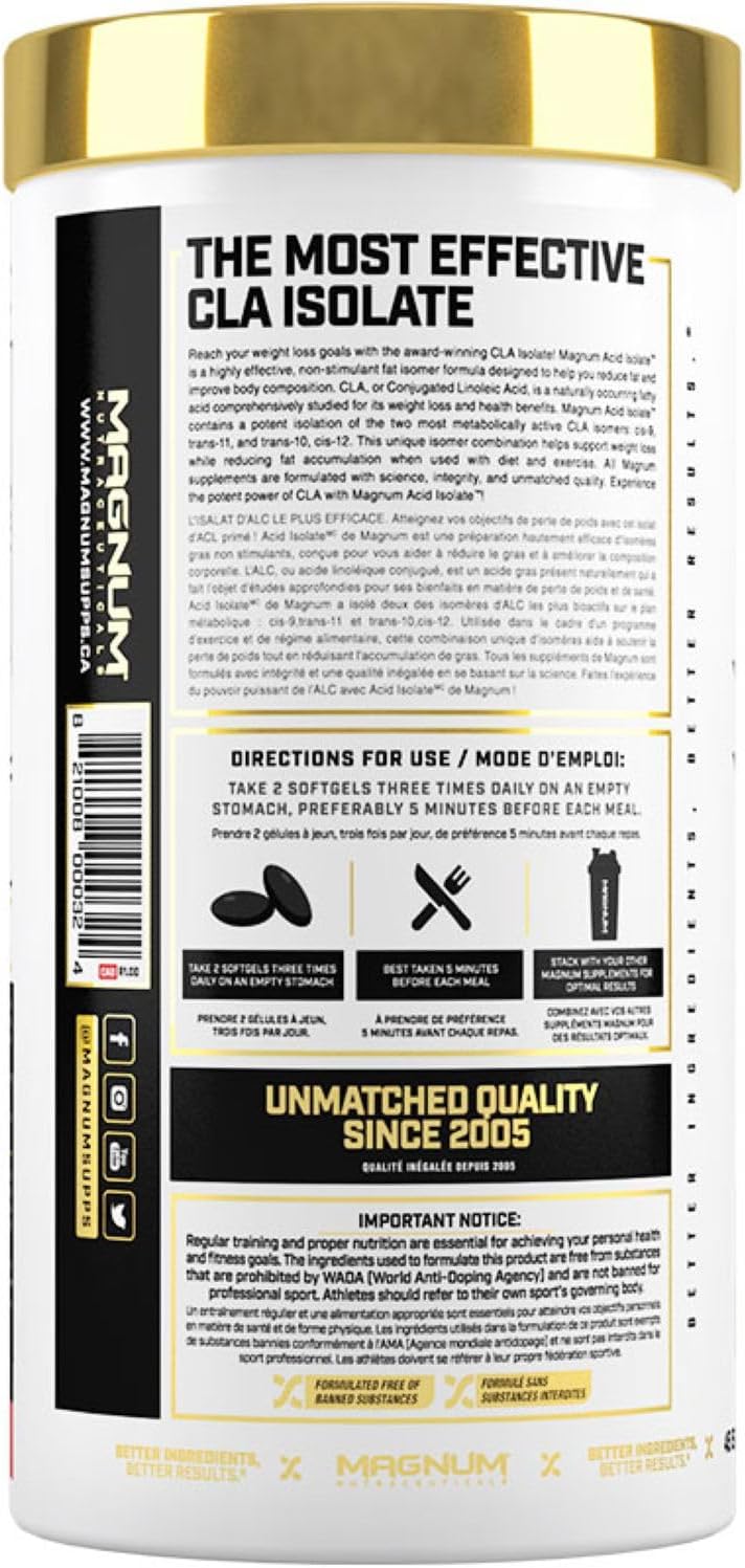 مکمل Magnum Acid Isolate با فرمول اختصاصی CLA برای حمایت از کاهش چربی و حفظ توده عضلانی طراحی شده است . ایزومرهای CLA شامل c-9 , t-11 و t-10 , c-12 فعالیت آنزیم های ذخیره کننده چربی را کاهش داده و مصرف کالری را افزایش می دهند . CLA موجود در اسید ایزوله مگنوم با افزایش سطح نوراپی نفرین ، یکی از قویت رین هورمون های چربی سوز بدن ، عملکرد متابولیک را ارتقا می دهد . این محصول با کنترل هوس غذایی و ایجاد احساس سیری ، به کاهش کالری دریافتی کمک می کند . اسید ایزوله Magnum بدون استفاده از محرک های شیمیایی مضر ، کاهش چربی و انرژی لازم برای تمرینات را فراهم می کند . همچنین با تامین سوخت مورد نیاز عضلات ، باعث بهبود عملکرد تمرینی و عضله سازی بدون چربی می شود .