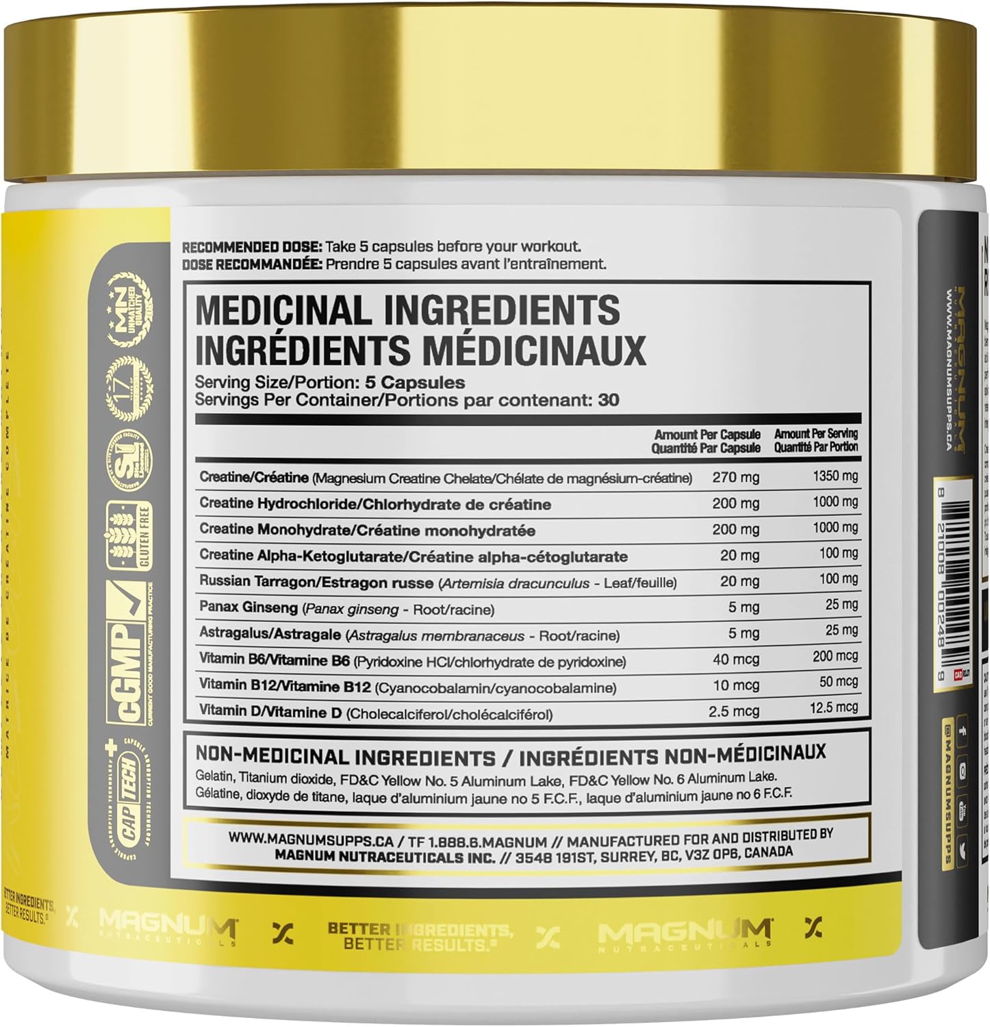 | هر5 کپسول دارای 1350 میلی گرم کراتین منیزیم کلات ، 1000 میلی گرم کراتین هیدروکلراید ، 1000 میلی گرم کراتین مونوهیدرات ، 100 میلی گرم کراتین آلفا کتوگلوتارات ، 100 میلی گرم ترخون روسی ، 25 میلی گرم جینسینگ پاناکس ، 25 میلی گرم عصاره ی گیاه گون ، 200 میکروگرم ویتامین B6 و 50 میکروگرم ویتامین B12 و 12.5 میکروگرم ویتامین D |