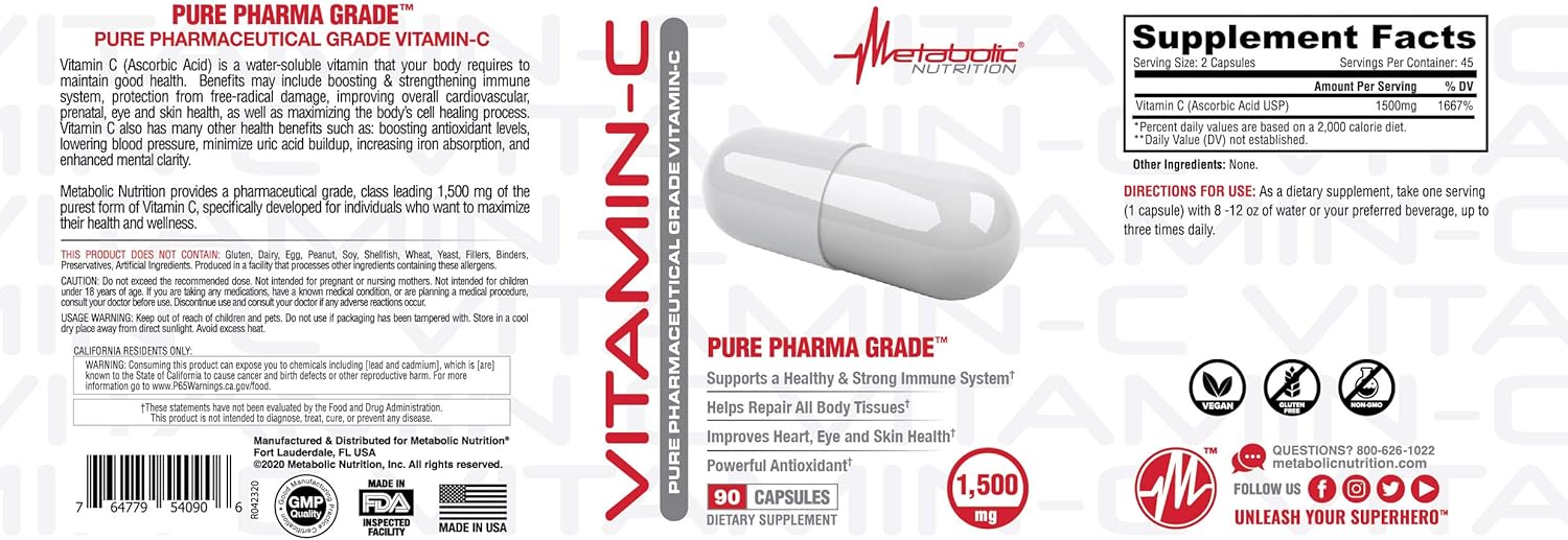 ویتامین سی یک ویتامین محلول در آب با دوز بالا است که نقش کلیدی در حفظ سلامت عمومی و عملکرد متابولیک بدن ایفا می کند . تامین روزانه 1500 میلی گرم ویتامین C با مصرف Metabolic Nutrition Vitamin C از ترمیم بافت ها ، تعادل قند و فشار خون و سلامت قلب و عروق پشتیبانی می کند . این مکمل با خاصیت آنتی اکسیدانی قوی ، از سلول ها در برابر آسیب رادیکال های آزاد محافظت کرده و به تقویت سیستم ایمنی کمک می کند . Vitamin C متابولیک متابولیسم اسید های آمینه ، سنتز انتقال دهندههای عصبی و افزایش جذب آهن و اسید فولیک نقش ضروری دارد .