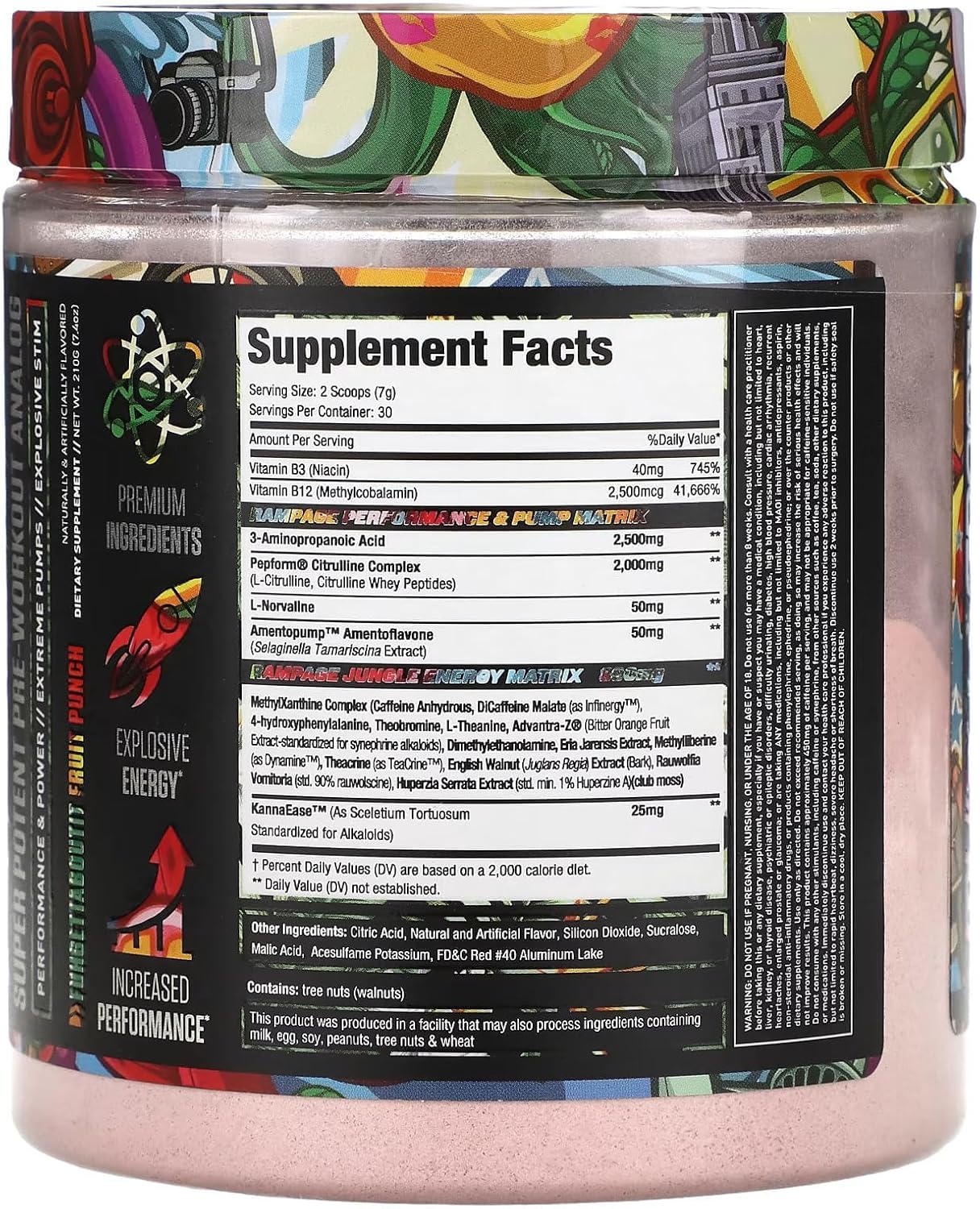 | هر وعده ( 7 گرم ) دارای 40 میلی گرم ویتامین B3 و 2500 میکروگرم ویتامین B12 و 2500 میلی گرم آمینوپروپانوئیک اسید ، 2000 میلی گرم کمپلکس سیترولین ، 50 میلی گرم نوروالین ، 50 میلی گرم Amentopump و 890 میلی گرم Rampage Jungle Energy Matrix ( کافئین بی آب ، تئاسرین ، سینفرین ، هیدروکسی فنیل آلانین و ... ) ، 25 میلی گرم پودر عصاره ی کانا |