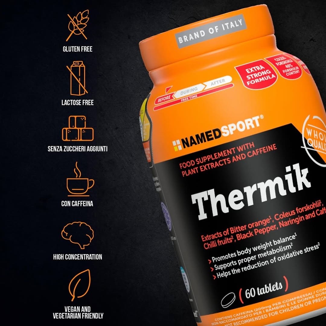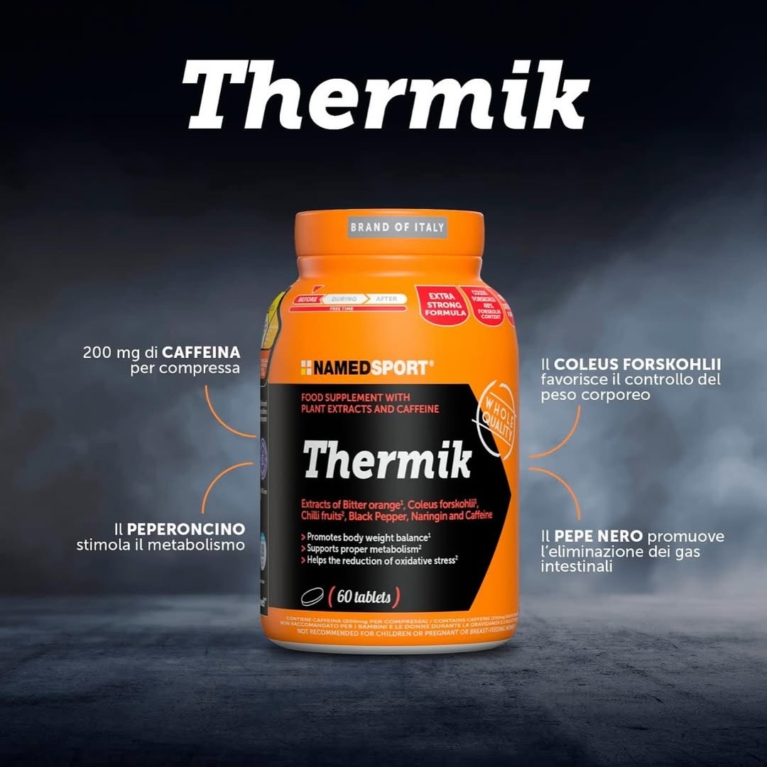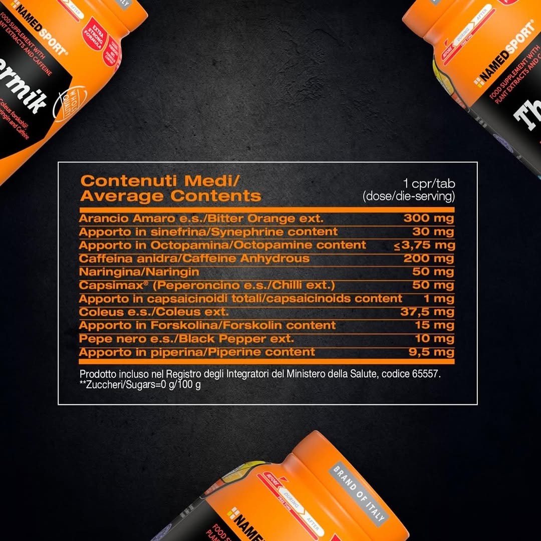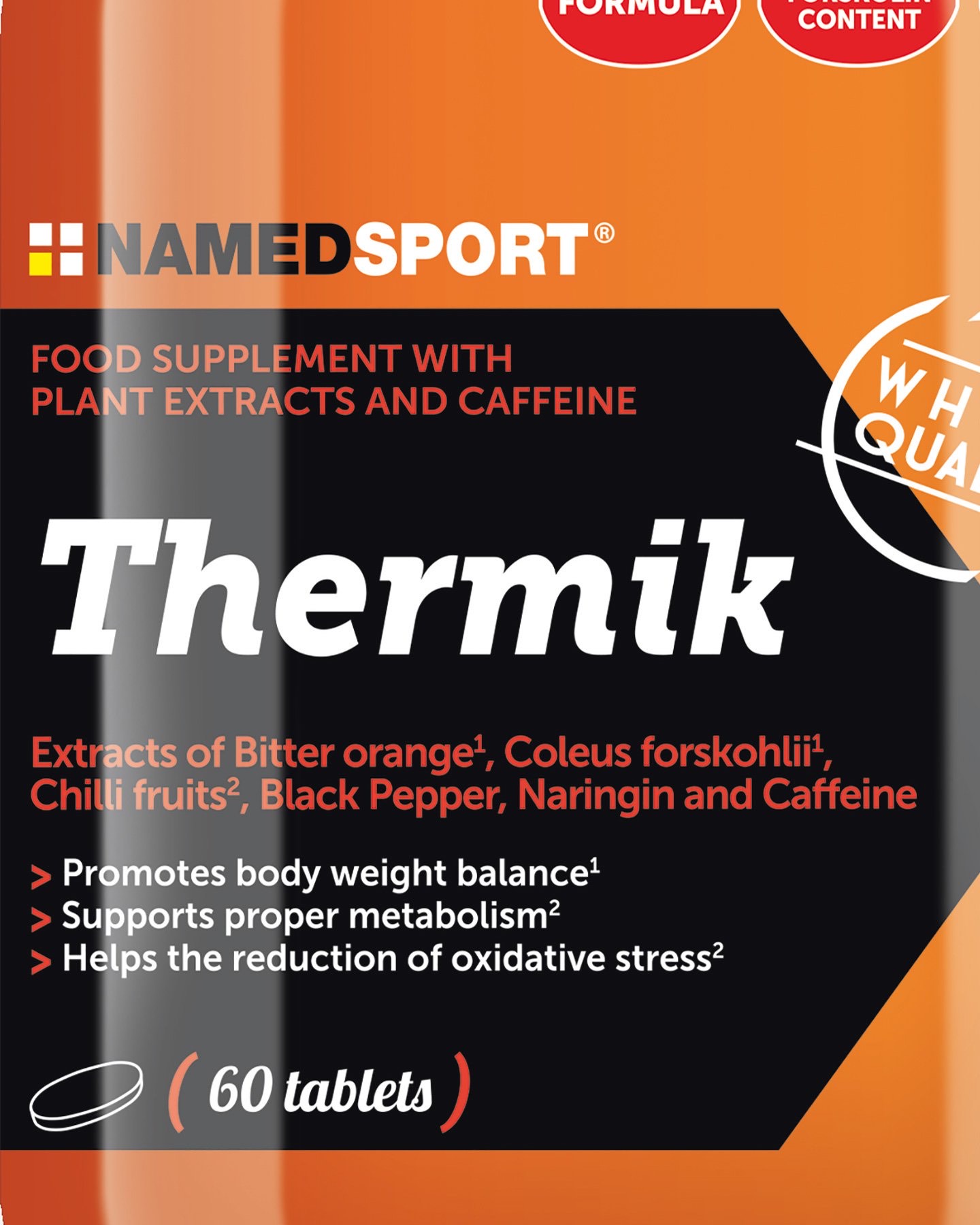 مکمل Named Sport Thermik یک فرمول چربی سوز ترموژنیک بر پایه عصاره های گیاهی و کافئین است که برای حمایت از ورزشکاران طراحی شده است . از ترکیبات این چربی سوز ، عصاره پرتقال تلخ با سینفرین موجود در آن است که سوخت و ساز بدن و چربی سوزی را افزایش می دهد و خواص آنتی اکسیدانی و ضد التهابی دارد . کافئین بدون آب در چربی سوز ترمیک Named Sport متابولیسم انرژی را افزایش داده ، خستگی را به تأخیر می اندازد و عملکرد تمرینی و تمرکز ذهنی را بهبود می بخشد . عصاره Coleus forskohlii در این محصول ، چربی سوزی و اثرات ضد التهابی را افزایش می دهد و از سلامت عمومی بدن را پشتیبانی می کند .