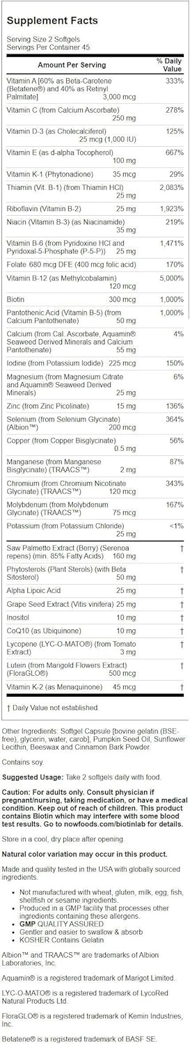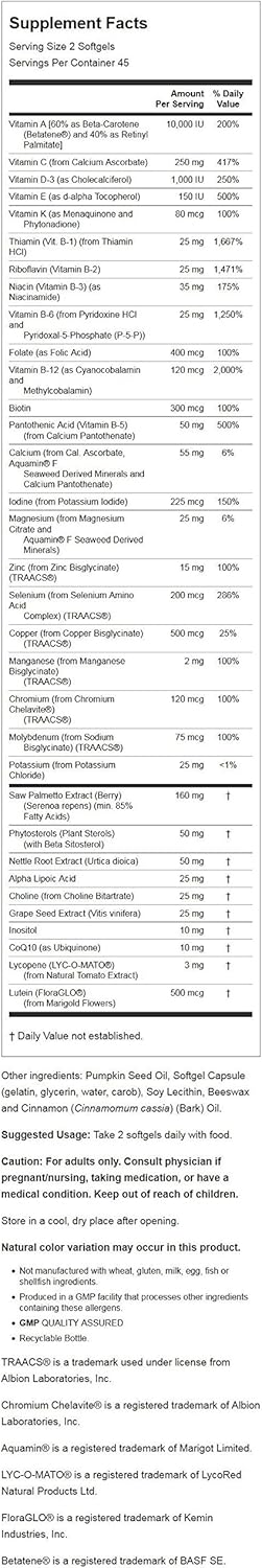 | هر 2 کپسول دارای 3000 میکروگرم ویتامین A و 250 میلی گرم ویتامین C و 25 میکروگرم ویتامین D3 و 100 میلی گرم ویتامین E و 35 میکروگرم ویتامین K1 و 25 میلی گرم ریبوفلاوین ، 35 میلی گرم نیاسین ، 25 میلی گرم ویتامین B6 و 680 میکروگرم فولات ( 400 میکروگرم اسید فولیک ) ، 120 میکروگرم ویتامین B12 و 300 میکروگرم بیوتین ، 50 میلی گرم اسید پانتوتنیک ، 25 میلی گرم کولین ، 55 میلی گرم کلسیم ، 225 میکروگرم ید ، 25 میلی گرم منیزیم ، روی ، سلنیوم ، مس ، منگنز ، کروم ، مولیبدن ، پتاسیم ، عصاره ی میوه نخل اره ای و ... |