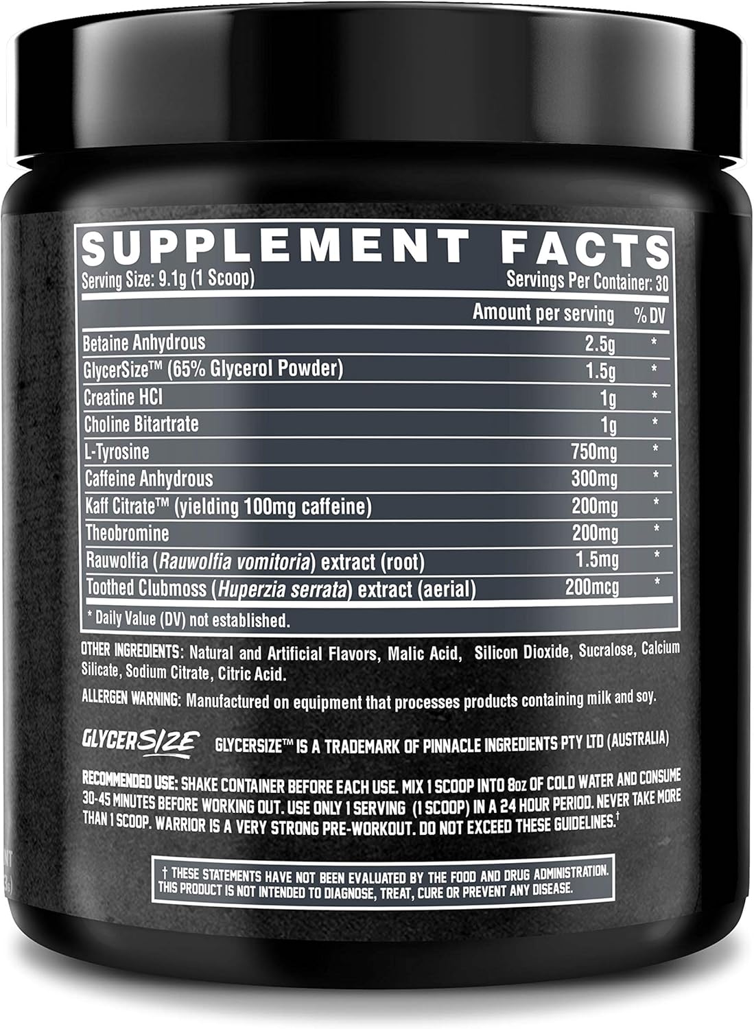 | هر 1 پیمانه ( 8.8 گرم ) دارای 2.5 گرم بتائین بی آب ، 1 گرم آرژنین سیلیکات تثبیت شده با اینوزیتول ، 1 گرم کراتین HCl و 1 گرم کولین بی تارتریت ، 750 میلی گرم ال تیروزین ، 300 میلی گرم کافئین بی آب ، 200 میلی گرم سیترات قهوه ، 200 میلی گرم تئوبرومین ، 1.5 میلی گرم عصاره ی راوولفیا و 200 میکرو گرم عصاره ی Toothed Clubmoss |