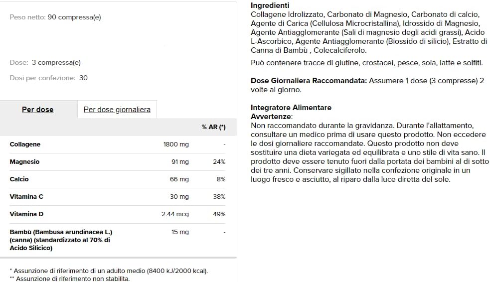| هر 2 قرص دارای 1200 میلی گرم کلاژن ، 61 میلی گرم منیزیم ، 44 میلی گرم کلسیم ، 20 میلی گرم ویتامین C و 1.60 میکروگرم ویتامین D و 10 میلی گرم عصاره ی ریشه بامبو ( با 70% سلیکای ارگانیک ) |
