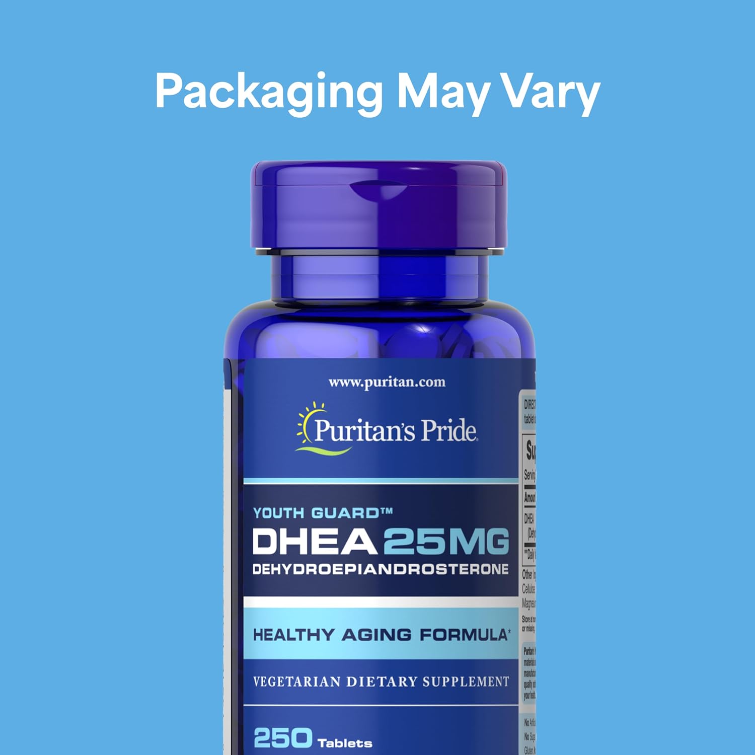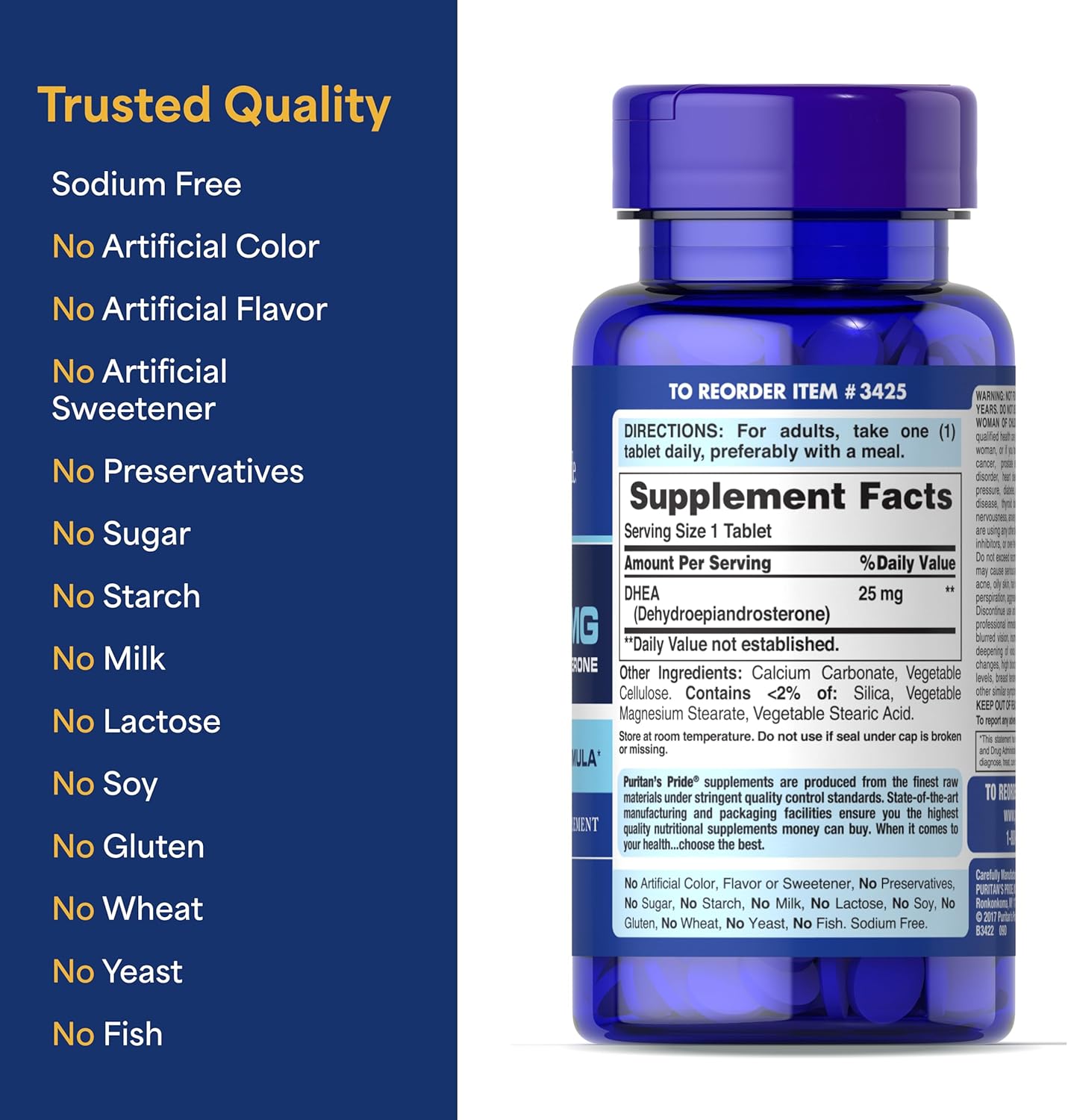مکمل DHEA پیوریتنز پراید با هدف جبران کاهش طبیعی هورمون DHEA در اثر افزایش سن طراحی و تولید شده است . این محصول با حمایت از سطح تستوسترون و استروژن به حفظ عملکرد طبیعی سیستم هورمونی کمک می کند . Puritan's Pride DHEA متابولیسم قند را بهبود داده و به کاهش چربی بدن کمک می کند . فرمولاسیون دی اچ ای ای پیوریتنز پراید فاقد گلوتن ، لاکتوز ، سویا ، شکر و افزودنی های مصنوعی است و مطابق استاندارد های کیفی و علمی تولید شده است .