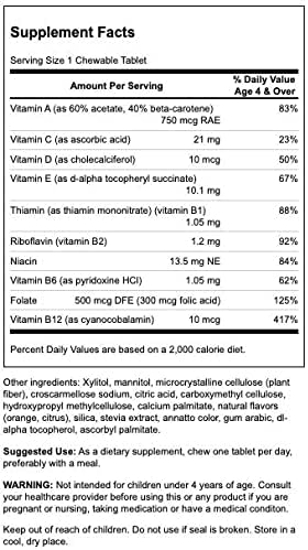 ویتامینهای گروه B و C در مکمل Chewable Multi for Children سوانسون از رشد شناختی و انرژی زایی سلولی حمایت می کند . مصرف مولتی ویتامین جویدنی سوانسون برای رشد بهتر ، تقویت سیستم ایمنی و حمایت از سلامت استخوان ، رفع کمبودهای تغذیه ای و اشتهای کم توصیه می شود .