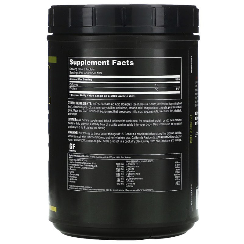 | هر3 قرص دارای 2 میلی گرم ویتامین B6 ، 3900 میلی گرم لوسین ، 1700 میلی گرم ایزولوسین ، 2800 میلی گرم والین ، 2100 میلی گرم ترئونین ، 5100 میلی گرم لیزین ، 2300 میلی گرم فنیل آلانین ، 300 میلی گرم تریپتوفان ، 1200 میلی گرم متیونین ، 1200 میلی گرم هیستیدین ، 7300 میلی گرم آرژنین ، 6200 میلی گرم اسپارتیک اسید ، 8800 میلی گرم آلانین ، 500 میلی گرم سیستئین ، 11300 میلی گرم گلوتامین ، 20100 میلی گرم گلیسین ، 9700 میلی گرم پرولین ، 900 میلی گرم تیروزین ، 3400 میلی گرم سرین |