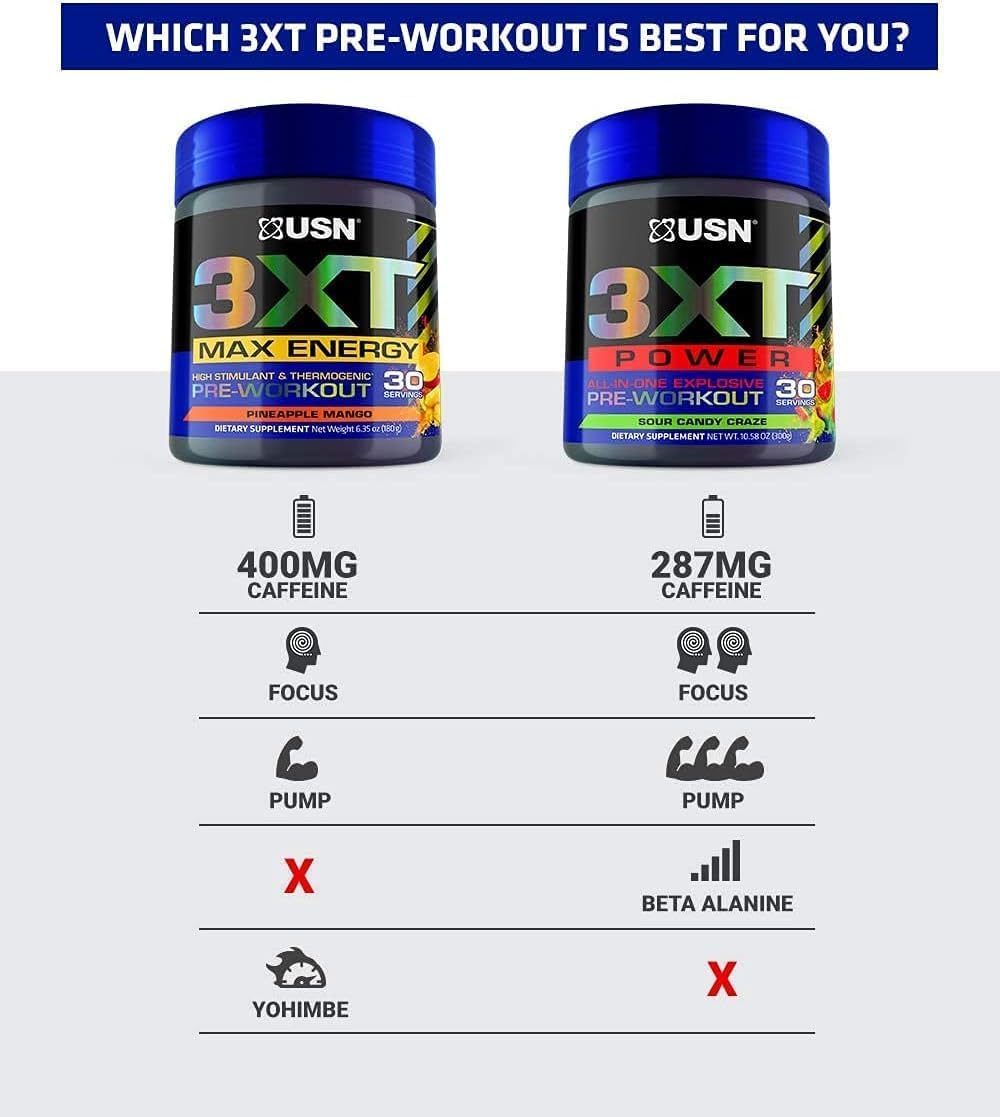 مکمل USN 3XT Max Energy با فرمول پیشرفته برای کاهش خستگی ، افزایش توان عصبی عضلانی و ارتقای کارایی ، مختص تمرینات شدید و حرفه ای تولید شده است .