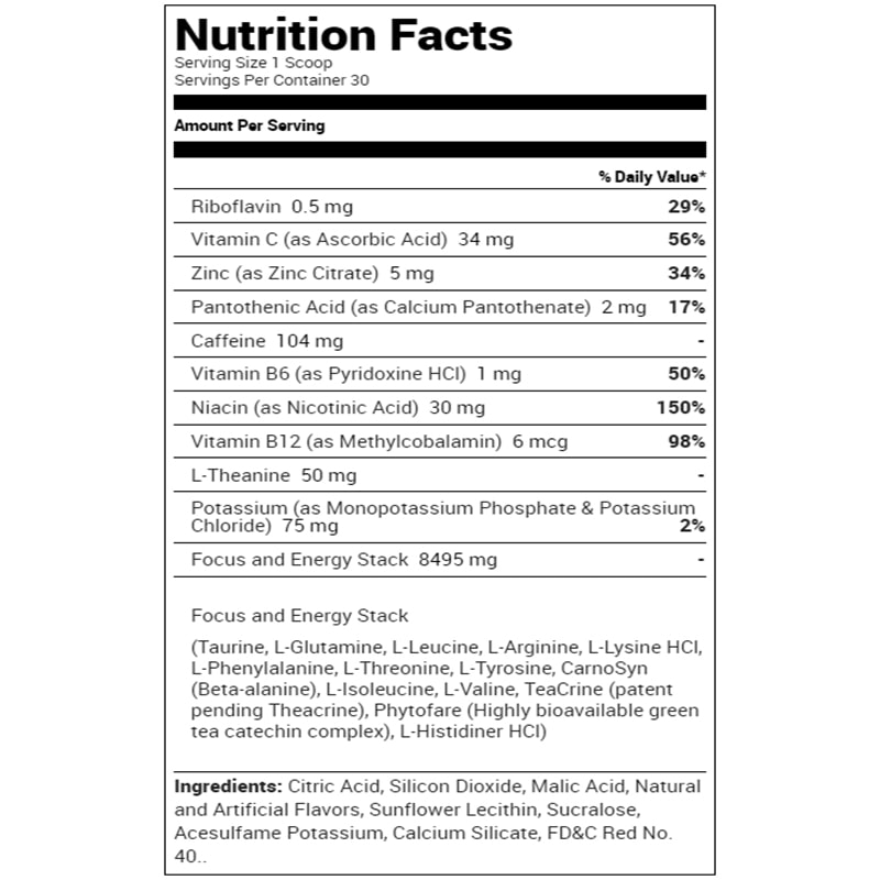 | هر وعده ( 9.5 گرم ) دارای 20 میلی گرم منیزیم ، 60 میلی گرم سدیم کلراید ، 80 میلی گرم سدیم ، 90 میلی گرم پتاسیم ، 4000 میلی گرم اسیدهای آمینه ی زنجیره ای شاخه ای با نسبت 1 : 1 : 2 و 1119 میلی گرم ال لیزین هیدروکلراید ، 521 میلی گرم ترئونین ، 140 میلی گرم فنیل آلانین ، 125 میلی گرم کافئین طبیعی InnovaTea از چای ، 100 میلی گرم نارگیل خام ، 100 میلی گرم هیستیدین هیدروکلراید ، 75 میلی گرم متیونین ، 45 میلی گرم تریپتوفان |