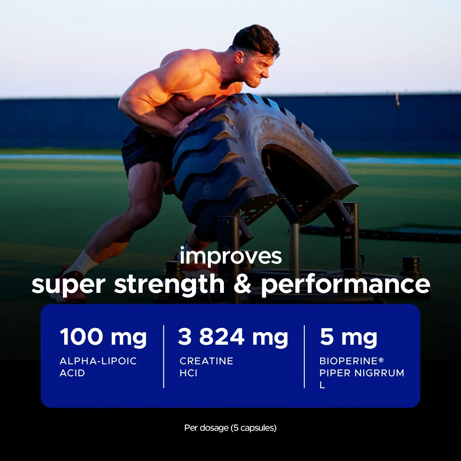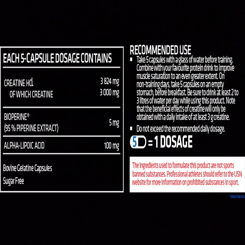 | هر 5 کپسول دارای 3824 میلی گرم کراتین HCL و 100 میلی گرم آلفا لیپوئیک اسید ، 5 میلی گرم بیوپرین |